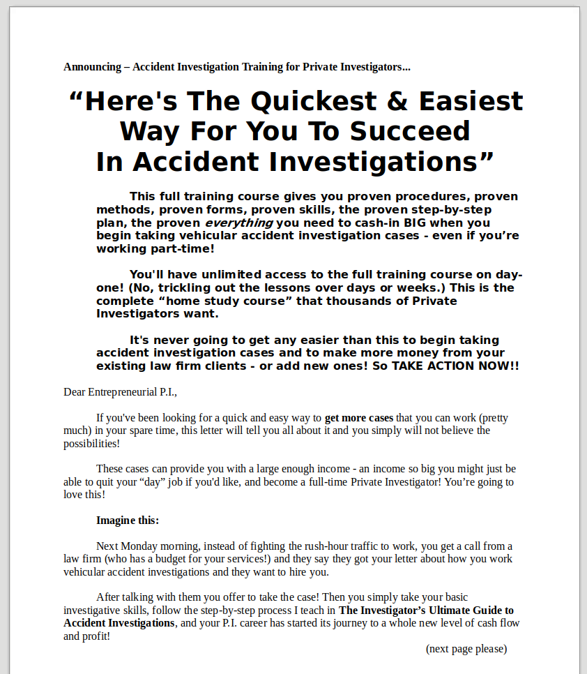 After talking with them you offer to take the case! Then you simply take your basic investigative skills, follow the step-by-step process I teach in The Investigator’s Ultimate Guide to Accident Investigations, and your P.I. career has started its journey to a whole new level of cash flow and profit!